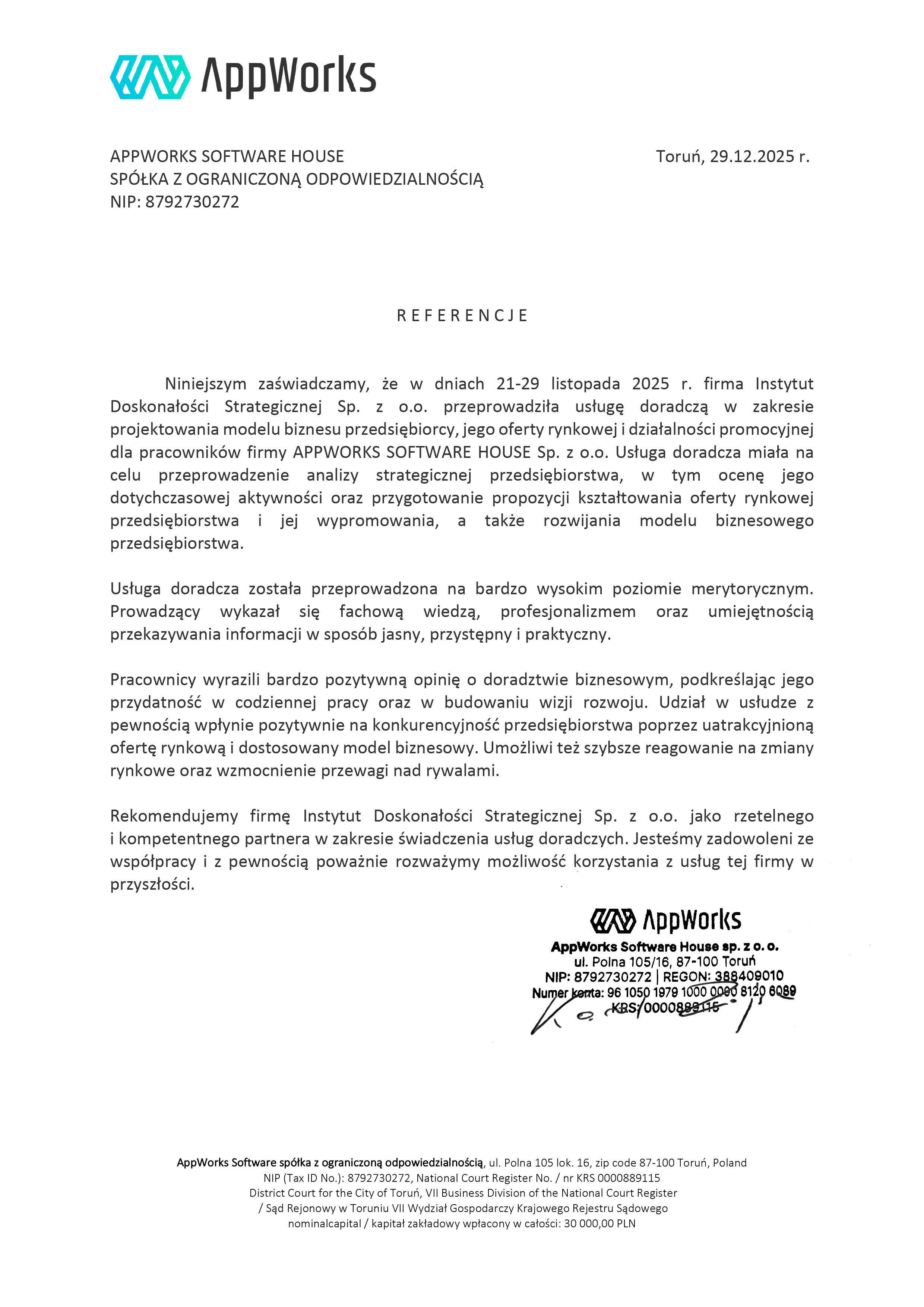 świadczącą profesjonalne i innowacyjne usługi doradcze oraz szkoleniowe,